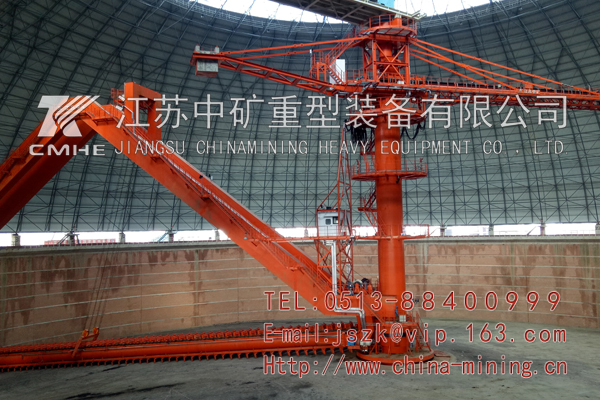 圓形料場堆取料機是懸臂堆料機與刮板取料機集于一體設備,是一種大型、環保、連續、 高效的散料裝卸機械,實用于碼頭、鋼鐵廠、水泥廠、大型火力發電廠和礦山等,可以裝卸鐵礦石(砂)、煤炭、砂子、石灰石、水泥等,圓形堆取料機被半球形網架外殼所籠罩,堆取料作業時集中于定心旋轉的回轉范圍內,不受臺風等惡劣天氣的影響,同時產生的揚塵范圍小,又被拘囿在固定的區域內,所以,它很好地解決了常規的敞開式條形煤場堆取料機作業時所產生的大量揚塵對周邊環境造成的大范圍污染,既美觀又環保,綜合效益高,具備儲料量大、占地面積小、場地利用率高、安全可靠性高、環保效益好等優點。取料和堆料作業時具備兩個層次分明的堆料回轉機構和取料回轉機構,使堆料機和取料機形成兩套互不干涉、相對獨立的運行系統,實現同時進行堆料和取料作業。我司目前有圓形堆取料機軌道直45m-120m各種規格。