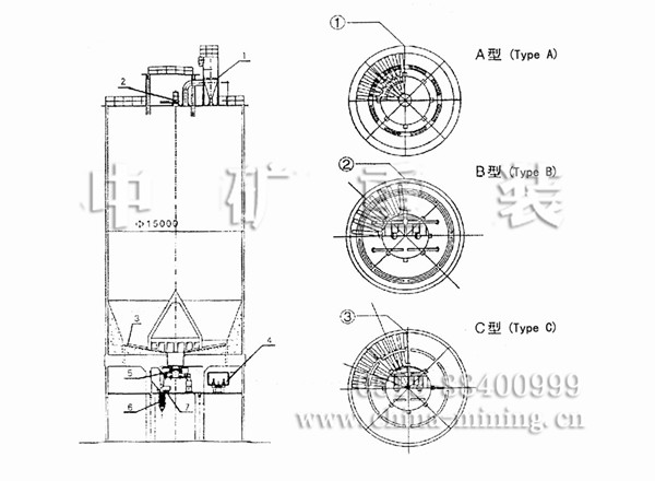 水泥儲(chǔ)存庫(kù)是在庫(kù)底中心位置設(shè)一錐形混合室,以降低庫(kù)內(nèi)的卸料壓力,消除漏斗流?;旌鲜?設(shè)8~12個(gè)進(jìn)料孔,在混合室和庫(kù)壁之間的環(huán)形區(qū)設(shè)有8~12個(gè)充氣區(qū),卸料時(shí)輪流向相對(duì)的環(huán)形小 區(qū)充氣,使部分水泥流向中心混合室。在自上而下的流動(dòng)過程中,切割水平料層而產(chǎn)生重力混合作 用,進(jìn)入混合室后又因混合室內(nèi)的連續(xù)充氣攪拌而進(jìn)一步均化。這種庫(kù)的均化值可達(dá)5~9。電耗 0.15~0. 30kwh / t.