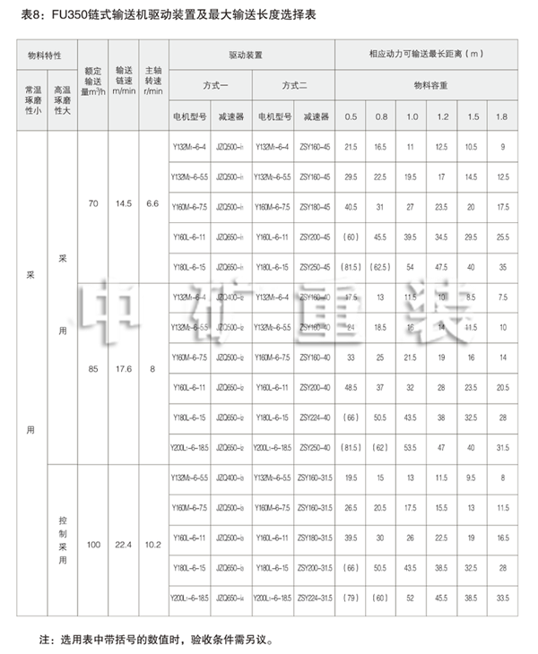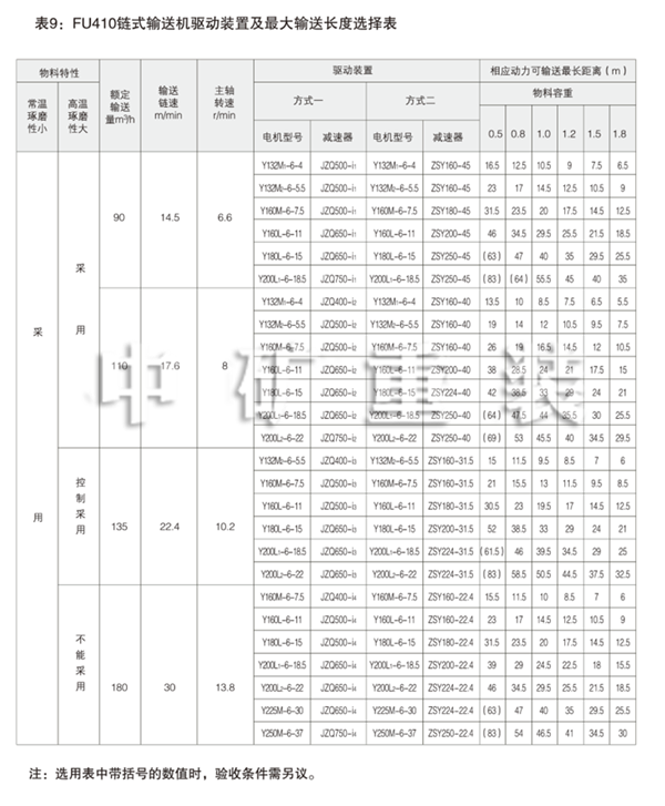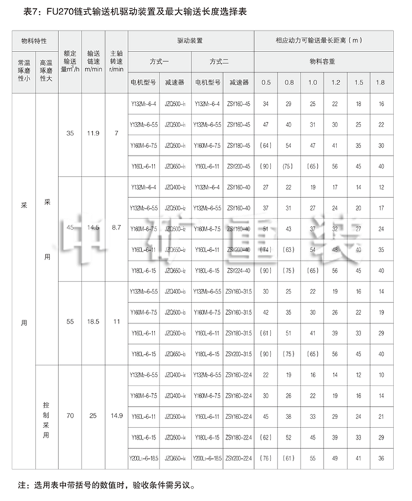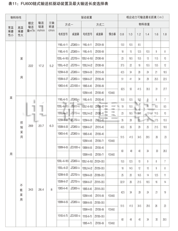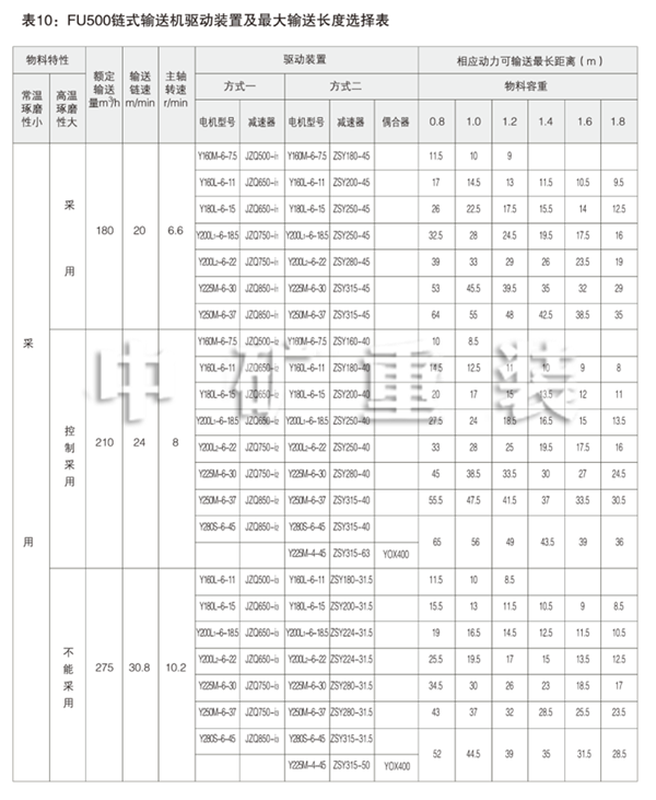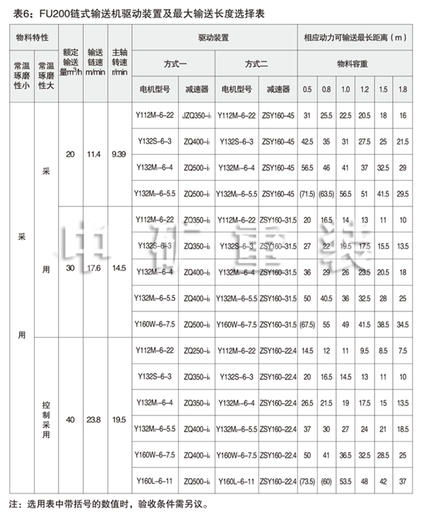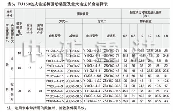 表5: FU150鏈式輸送機驅動裝置及輸送長度選擇表 Table 5: FU150 Chain Conveyor Drives and Max Conveying Distances
